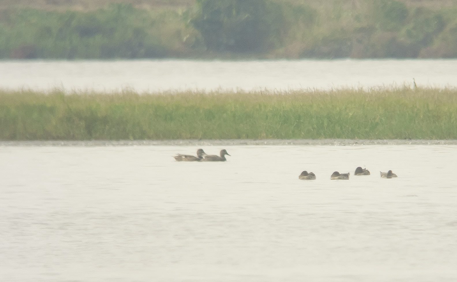 The highlight was two Gadwall, comparatively rare ducks this far south in Thailand. Of course the real story is finding them in amongst everything else. I would estimate there were in the region of 2,500 Northern Pintail and an estimated 1,500 Garganey; add in the fact that they were at least 500m away. So I was pleased to get a couple of images for the record, as it were, and indeed to enable me to get the ID confirmed. Dave Gandy has confirmed they are Gadwall and Phil Round has also done so and now Tom Backlund has too – thanks. The key feature that stands out in these ducks is the smallish white patch that can be seen towards their tails; this is in fact on the wing and is much more visible when the bird is in flight. As I scoped the two of them dabbling away I also thought the bills were different from everything else nearby, just a sense as opposed to a specific detail. If anything I thought the bill tip was a little rounder and that overall it was quite slender. Fortunately I was able to get a shot.