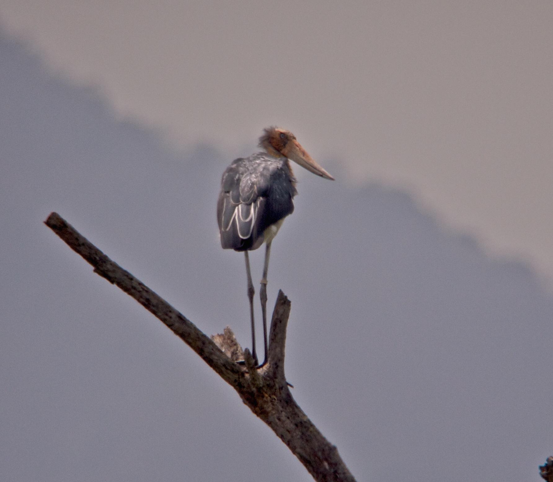 In the end we went out en famille to Bang Pra late morning. As with Suan Rot Fai I’ve been here before but under time pressure. This time we drove into the Non-hunting Area and our first bird was a Lesser Racket-tailed Drongo, minus its right side racket and streamer. We drove south and recorded six White-crested Laughing-thrush, truly amazing looking birds which had Luna purring. We drove on and picked out an Osprey perched on a tree and then as we progressed, in among some Open-bills perched on a dead tree was a huge Adjutant Stork. Once I got my bins on it,it was clearly a Lesser Adjutant. However celebrations were dampened by the near certain likelihood that this is an introduced bird. Khao Kiew Open Zoo is nearby and apparently they have bred Adjutants in captivity there which have either escaped or been released and taken up residence in Bang Pra. The presence of a ring on the right tibia of my chap confirmed that humans have had their hands on this bird – therefore not a real wild bird. So no tick, but what the hell, it is as good as the real thing. It really doesn’t detract from this bird’s almost hideous, primordial appearance. we were both purring this time and our kids couldn’t understand the fuss about being quiet as I scurried about trying to get a photograph.
